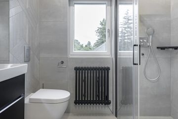 Do následující koupelny si domácí vybrali obklad a dlažbu ze série Metaline od italského výrobce Italgraniti v barvě steel. Obklad je na stěně za umyvadlem se skříňkou od německého výrobce Villeroy & Boch kombinovaný mozaikou Metaline steel ve formátu 29x34 cm. Koupelna je doplněná dále umyvadlovou armaturou Axor Uno a chromovými koupelnovými doplňky Round od německého výrobce Emco. Jednou z dominant této koupelny je designový radiátor Charlestone v černé matné barvě od švýcarského výrobce Zehnder.