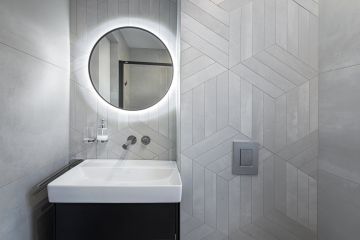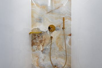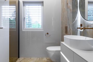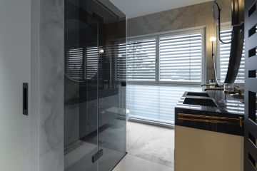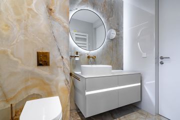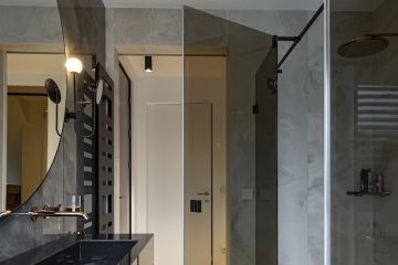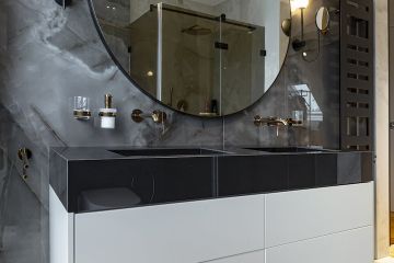 V hlavní koupelně byly použité obklady od italského výrobce Florim ze série Reves v kombinaci barvy choco a perle. Na podlahu přišla dlažba v matném odstínu perle. Hlavní dominantou této koupelny je dvojumyvadlo o rozměru 160x48 cm, které bylo vyrobeno v naší výrobě Technoart. Toto atypické umyvadlo jsme vyrobili z dlažby B&W v černé barvě od italského výrobce Florim. Umyvadlo doplňuje na míru vyrobená skříňka se zadním stěnovým osvětlením. Celkový dojem z této koupelny umocňuje velké kulaté zrcadlo o průměru 130 cm spolu s osvětlením London Light Orb Black. Vodovodní baterie a koupelnové doplňky jsou od německého výrobce Grohe v barvě warm sunset. Za povšimnutí stojí i na míru vyrobený sprchový kout od německého výrobce Hüppe ze série Solva v bezrámovém provedení v černé barvě se sklem v barvě bronze.