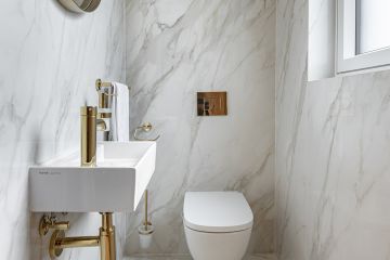 V samostatném WC je obklad Étoile v barvě créme od výrobce Florim. Na podlaze je stejný materiál, který je ale v jiném formátu, tloušťce a v matném povrchu. Malé umyvadlo pochází ze série Kartell a WC mísa ze série Palomba od značky Laufen. To je dotvořeno koupelnovými bateriemi a doplňky Essence v barvě cool sunrise od značky Grohe.