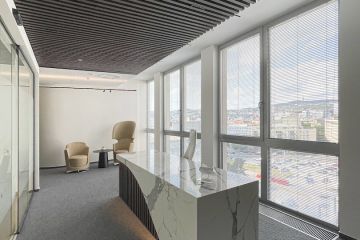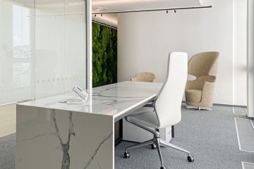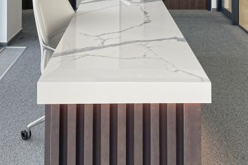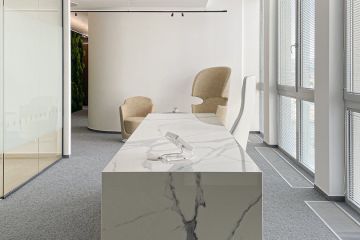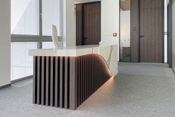 Klient svůj nový recepční pult už naplno využívá a my jsme hrdí, že jsme mohli tímto přispět ke krásným novým interiérům, které navrhl tým ateliéru KOSI Architekti v čele s panem architektem Pavlem Kosnáčem. Dodávku materiálu jsme zajišťovali my, o zpracování - řezání obkladu se postaral TechnoArt a špičkové realizace na místě se zhostili naši partneři Lioness Design s.r.o.