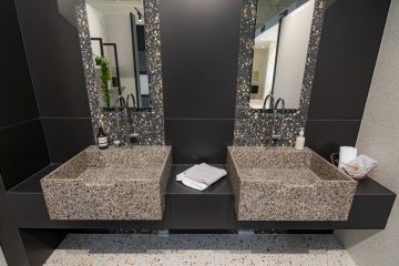 Podlahu a částečně stěny zdobí nádherná řada Venice Villa od firmy Iris. Z tohoto materiálu jsme zhotovili i umyvadlo či odkládací plochy a to vše ručně v naší výrobě TechnoArt. Takováto umyvadla umíme připravit i pro vás. Můžete nás kontaktovat napřímo a my se vám rádi budeme věnovat.
