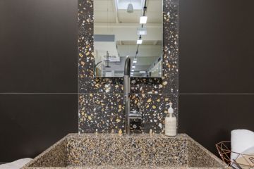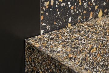 Černý obklad vytváří příjemný kontrast a dává vyniknout detailu. Nemuseli jsme se dlouho rozmýšlet a rovnou jsme sáhli po námi oblíbené řadě B&W Marble od značky Floor Gres.