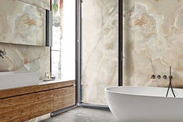Onyxová stěna je prvek, který sám o sobě funguje jako umělecký předmět, strhává na sebe veškerou pozornost, ale…má funkci. A právě to je myšlenka, která s námi rezonuje a kterou si nenecháme rastrovat zbytečným množstvím spár.