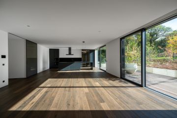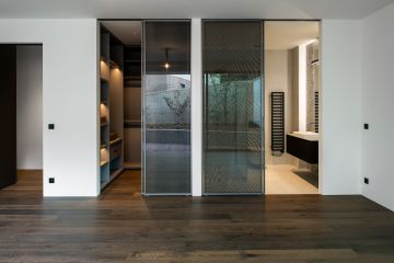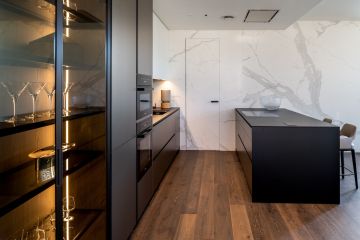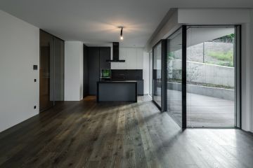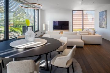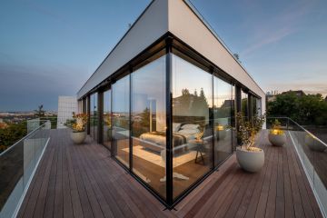 V rámci interiéru byly použity jen ty nejluxusnější materiály od renomovaných výrobců, jakými jsou Italgraniti, Duravit, Kaldewei, Zehnder, Hüppe, Axor. Naše materiály jsou použity taktéž ve společných prostorech domu a především na střešní terase, kdy dlažba od výrobce Ermes ve formátu 40x80x2 cm dotváří atmosféru bazénu se skleněným dnem, který je pomyslnou třešničkou na dortu. Při samotné realizaci jsme řešili spoustu zajímavých a originálních detailů, jakými byly například umyvadlové desky, velkoformátový obklad za kuchyňskou linku nebo jako dekorační stěnu v interiéru či atypické schodové tvarovky v rámci schodiště a terasy, kde jsme plně využili náš výrobní závod TechnoArt.