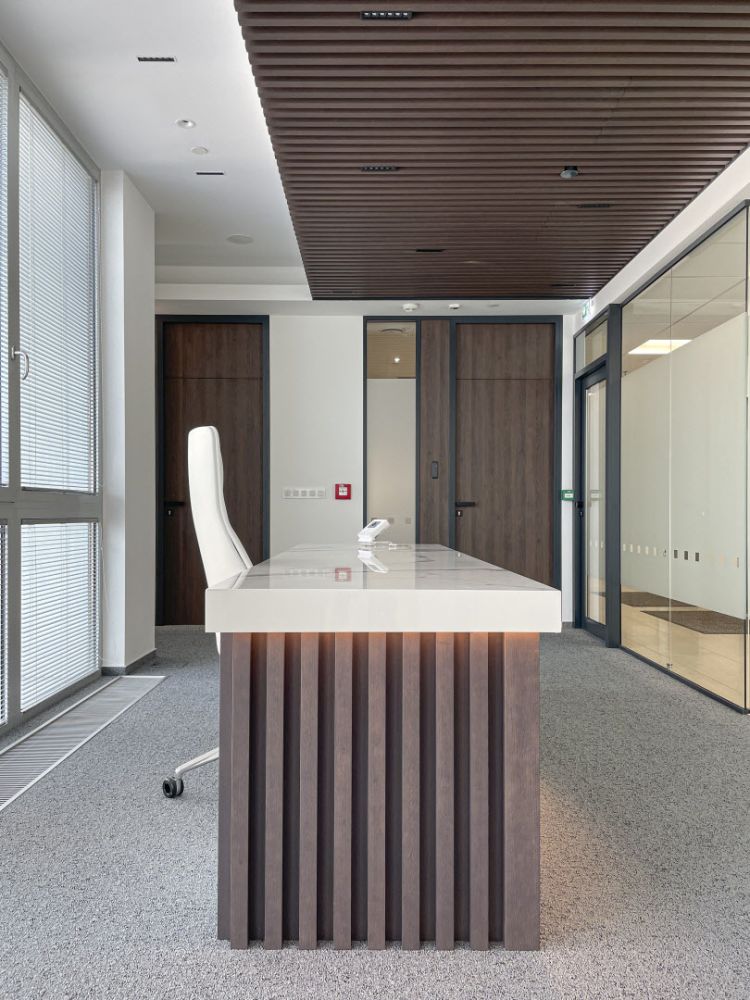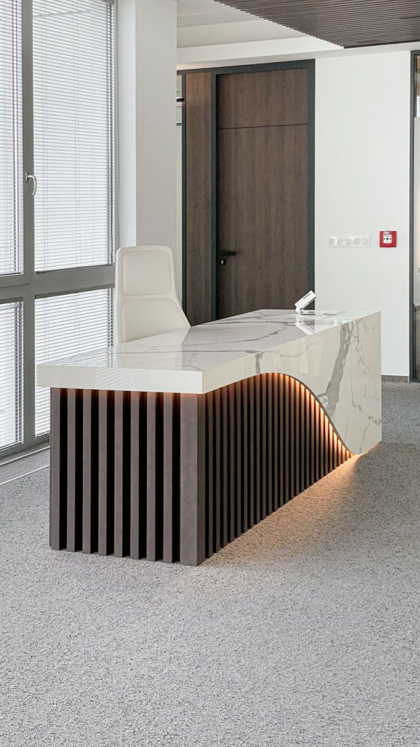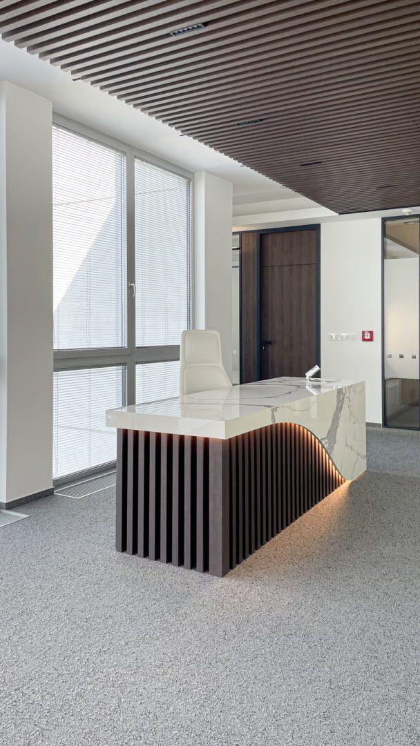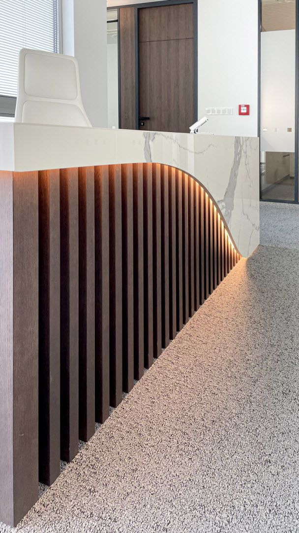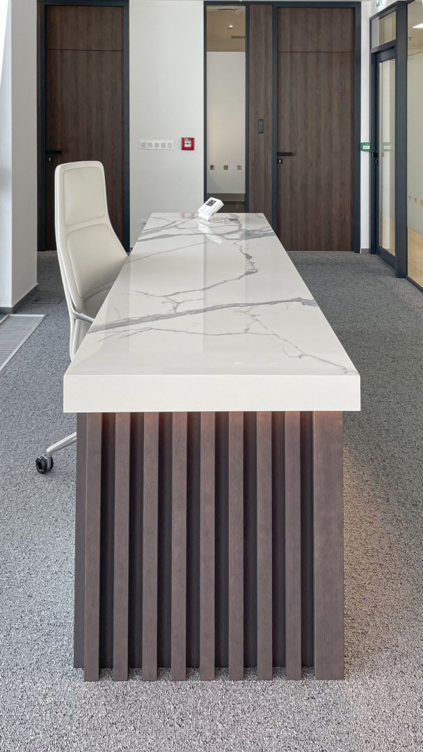 Pro klienta jsme vyráběli tento recepční pult. Na výrobu byly použité dřevěné lamely a keramický obklad v designu mramoru ze série I Classici di Rex od výrobce Florim. Všechny části pultu jsme nařezali z jednoho kusu obkladu formátu 160x320 cm. To znamená, že na jeho povrchu nenajdete žádné spáry.