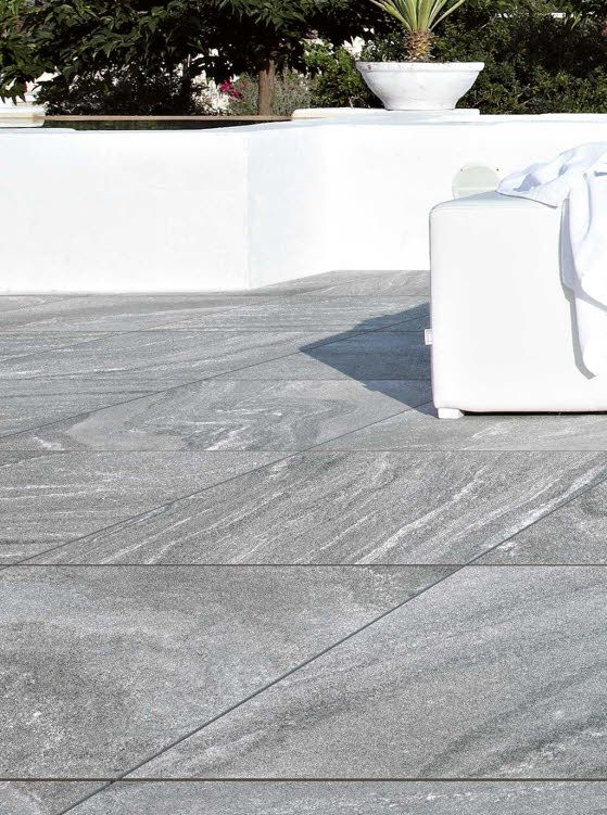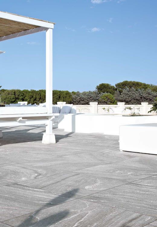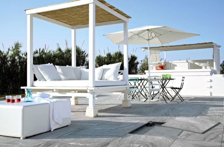 Na podlahu terasy tohoto hotelu byla použita dlažba italského výrobce Floorgres. Konkrétně se jednalo o dlažbu série Tech#2 ve formátu 60x60 cm v barvě Light gray a síle střepu 2 cm. Pokládka byla realizována pomocí stavitelných terčů.