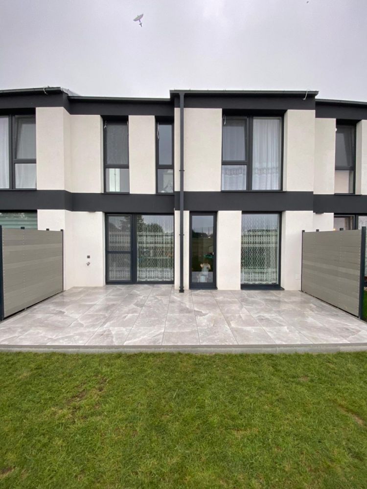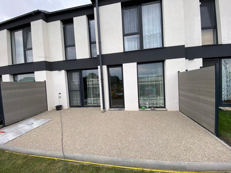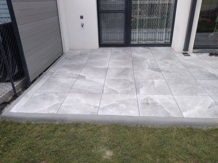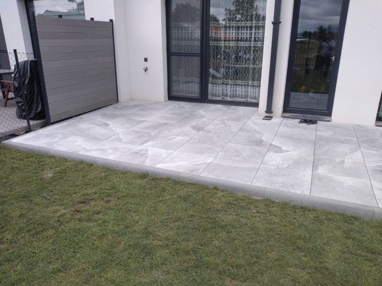 Na venkovní terasu jsme použili keramickou dlažbu ze série Rock Salt od výrobce Cerim v designu Celtic Grey. Tato dlažba věrohodně imituje přírodní kámen a díky síle střepu 2 cm je vhodná k použití do exteriéru.
