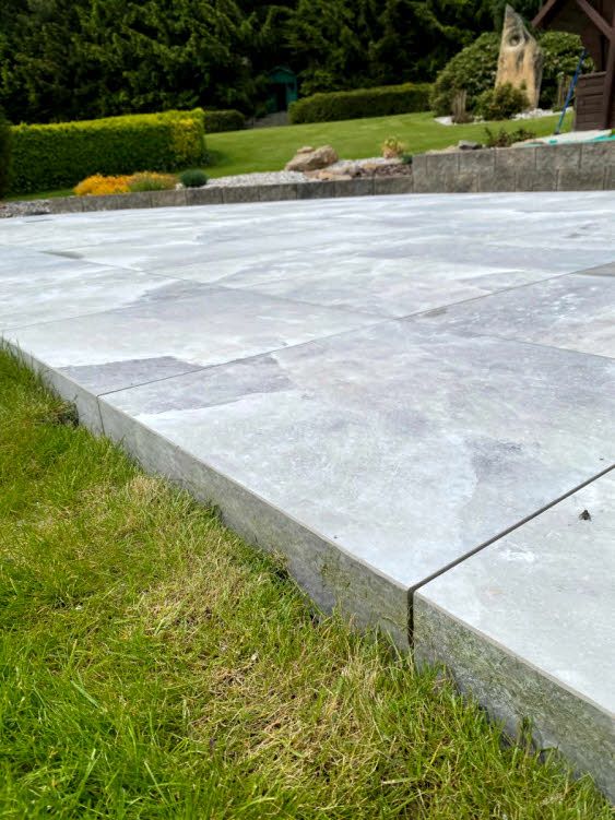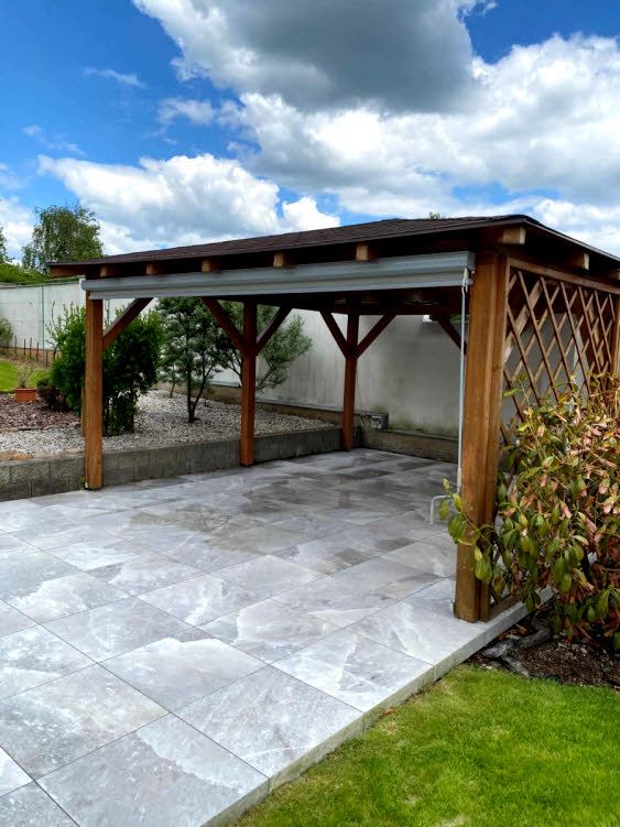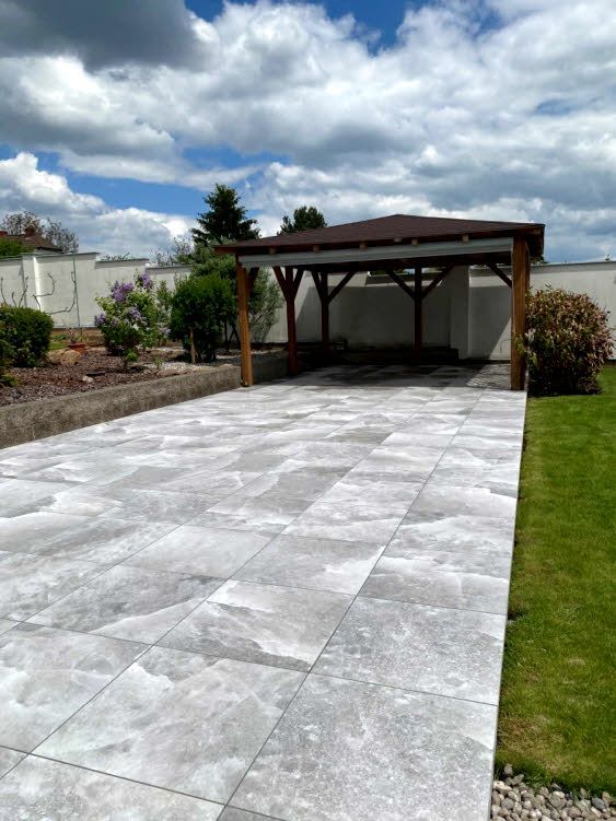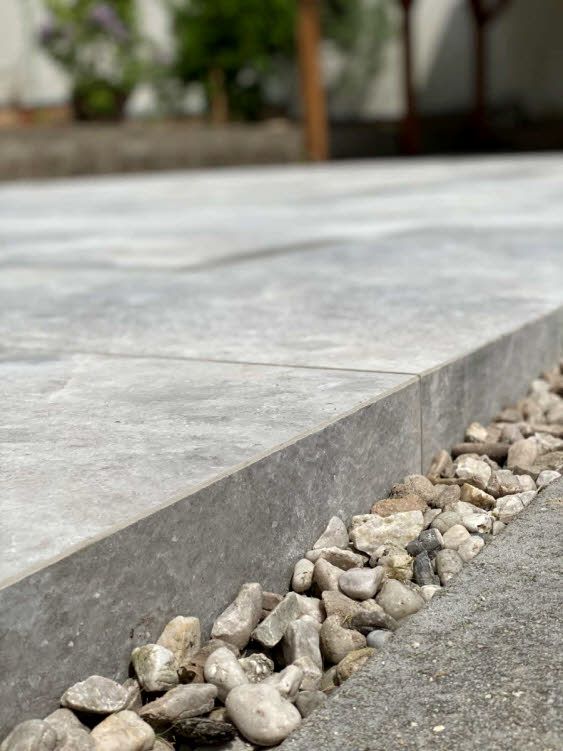 Pro soukromého investora jsme dodali keramickou dlažbu Rock Salt v designu celtic grey od výrobce Cerim, která vyniká hloubkou své kresby. Dlažba je v tloušťce 2 cm, je tedy ideální pro použití do exteriéru. Zakončení terasy bylo naformátováno vodním paprskem v našem výrobním závodě TechnoArt a následně byly vytvořeny tzv. "K" hrany, které dokonale začišťují zakončení exteriérové terasy.