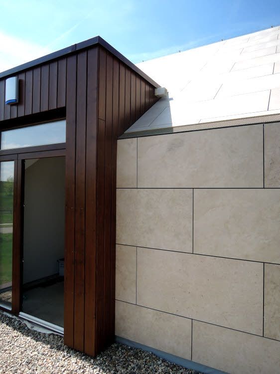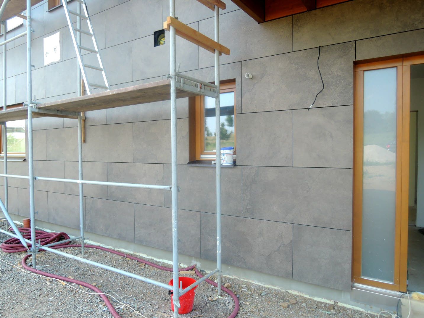 Tato realizace provětrávané fasády rodinného domu na Šumavě je specifická nejen technologicky, ale i designově. Na fasádu i střechu jsme použili keramickou dlažbu ze série Stone Mix od italského výrobce Italgraniti a to ve formátu 60x120 cm s tloušťkou střepu 10 mm. Při lepení dlaždic jsme využili nové technologie švýcarského výrobce SIKA. Dlaždice byly lepeny přímo na hliníkové profily (střecha) a dřevěné profily (stěny) speciálním lepidlem.