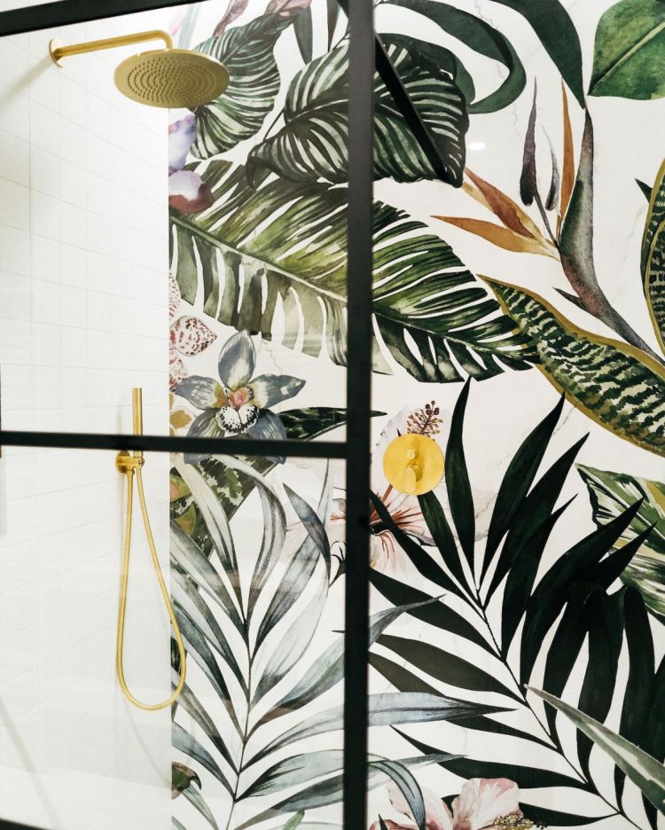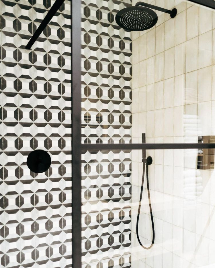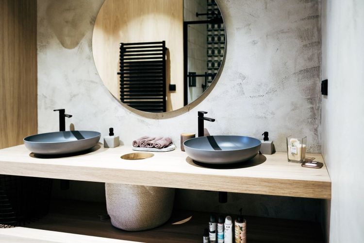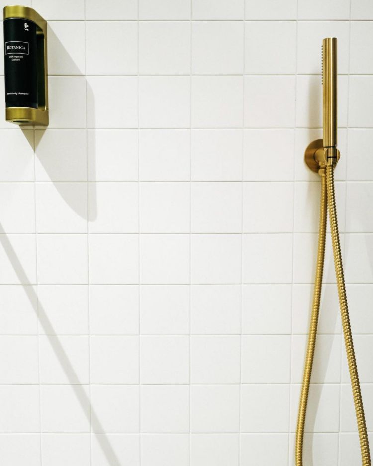 Do šaten ve studiu Boutique Yoga jsme vybrali obklady a dlažby od výrobců Iris a CE.SI. V pánské šatně jsme zkombinovali série May a Industrial ivory, v dámské šatně obklad Full body a DYS v designu wild flowers. Z koupelnového vybavení jsme zvolili sprchové kouty Riho Grid a umyvadla ze smaltované oceli Kaldewei v odstínech cool grey a warm grey, které jsme dotvořili matně černými a pozlacenými vodovodními bateriemi Graff Phase.