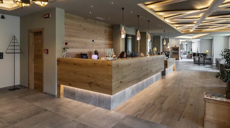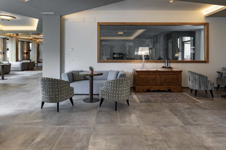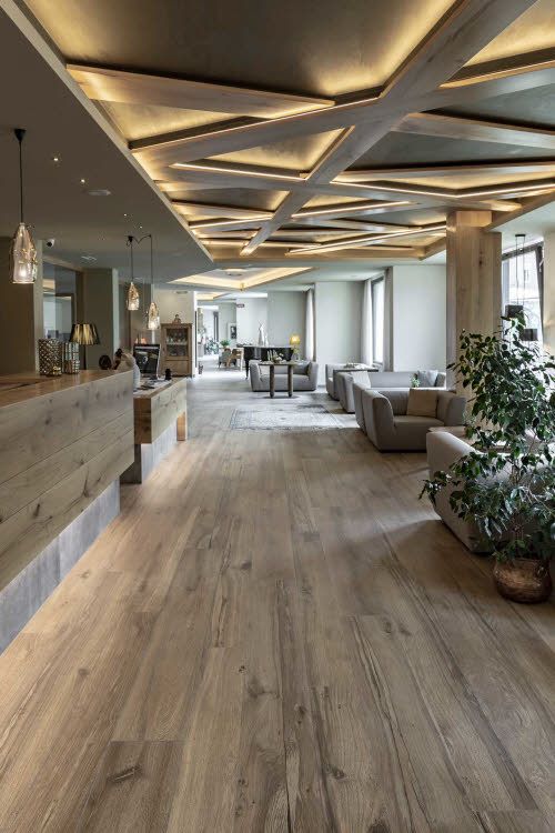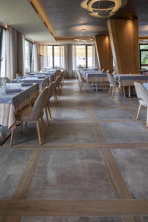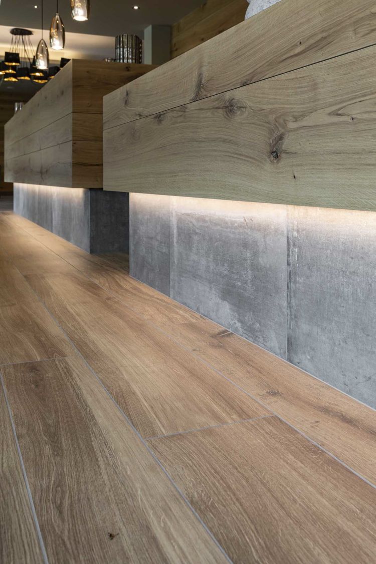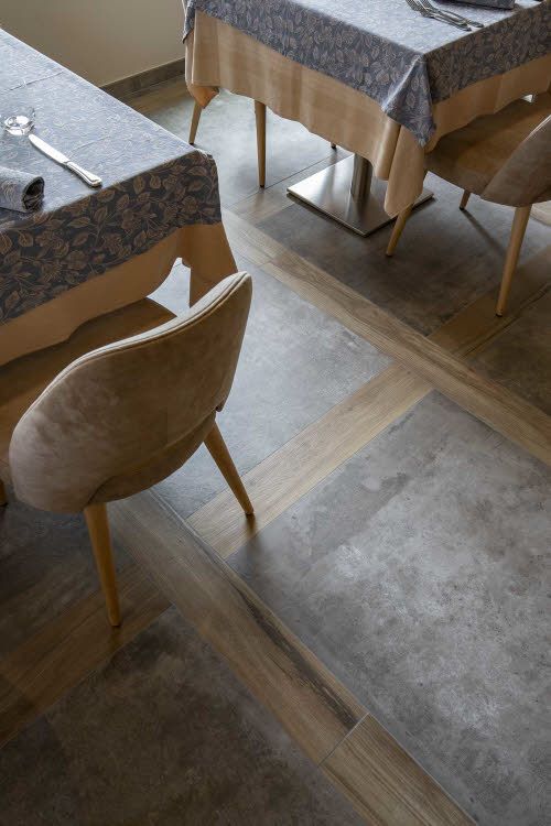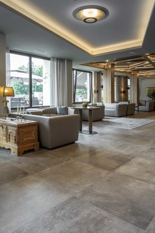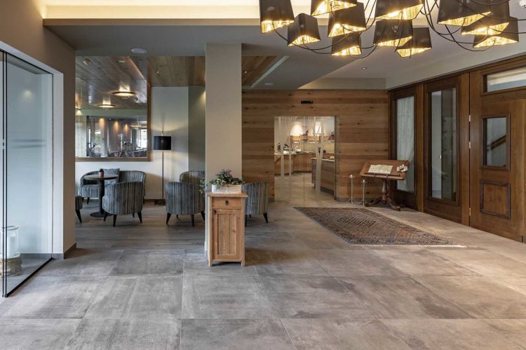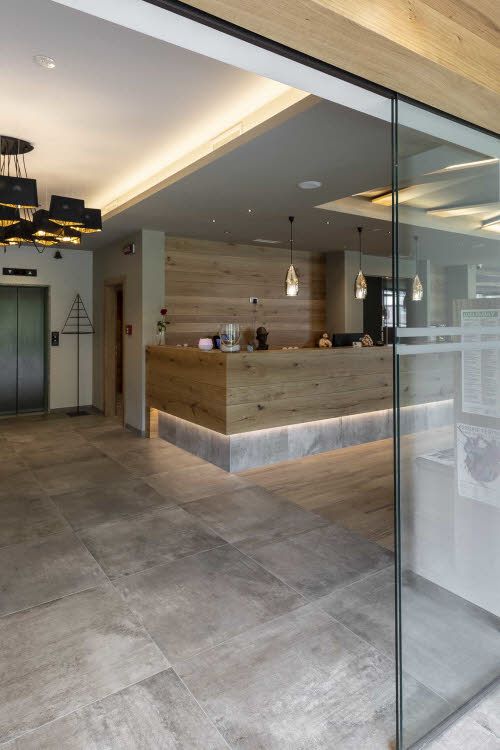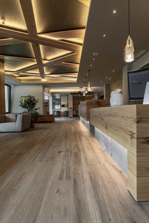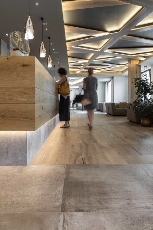 Velice netradiční a zajímavá kombinace dlažby v designu dřeva a betonu ve vstupní hale nově zrekonstruovaného horského hotelu. Konkrétně se jedná o série Matiéres v designu nuage a Planches v designu noisette od italského výrobce REX ze skupiny Florim Group.