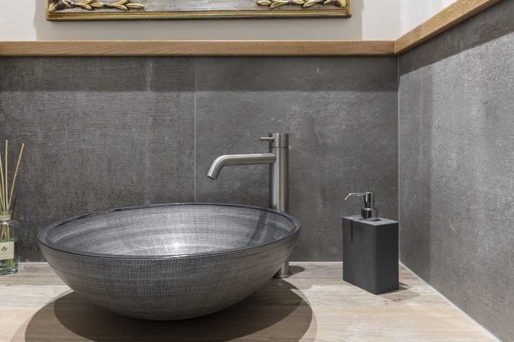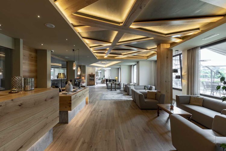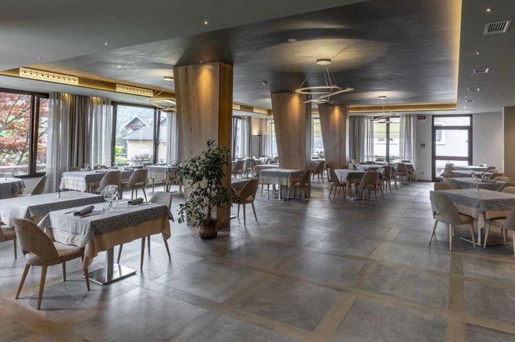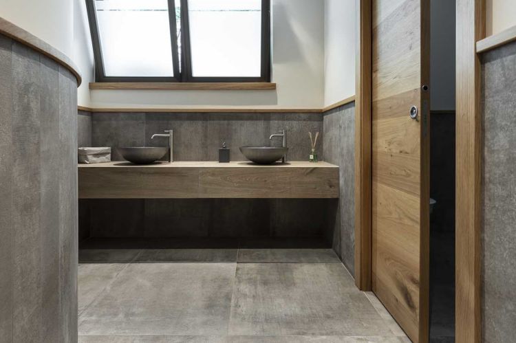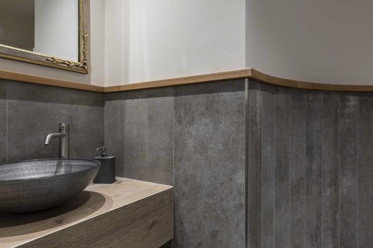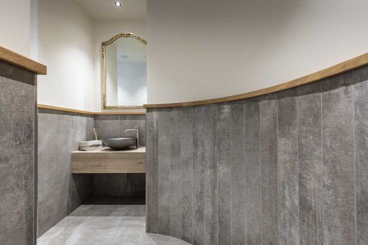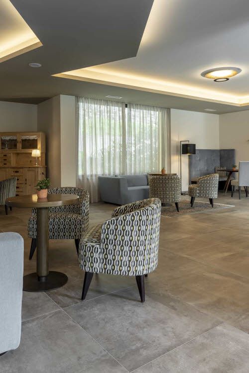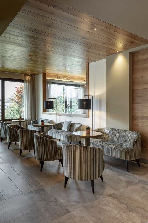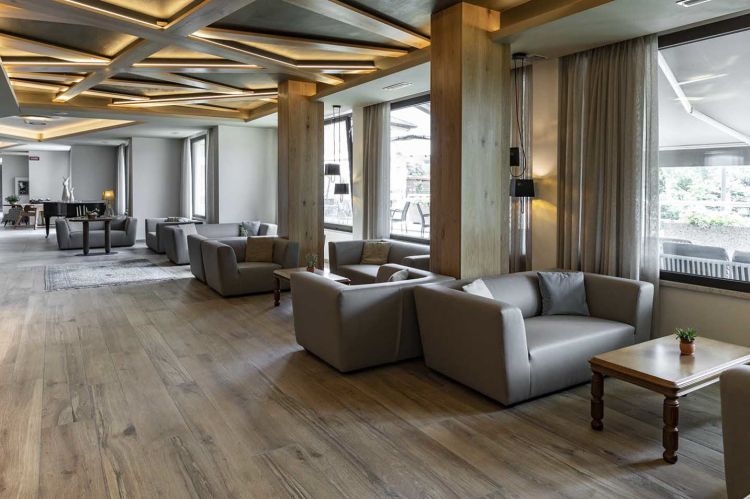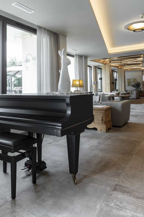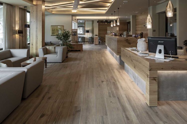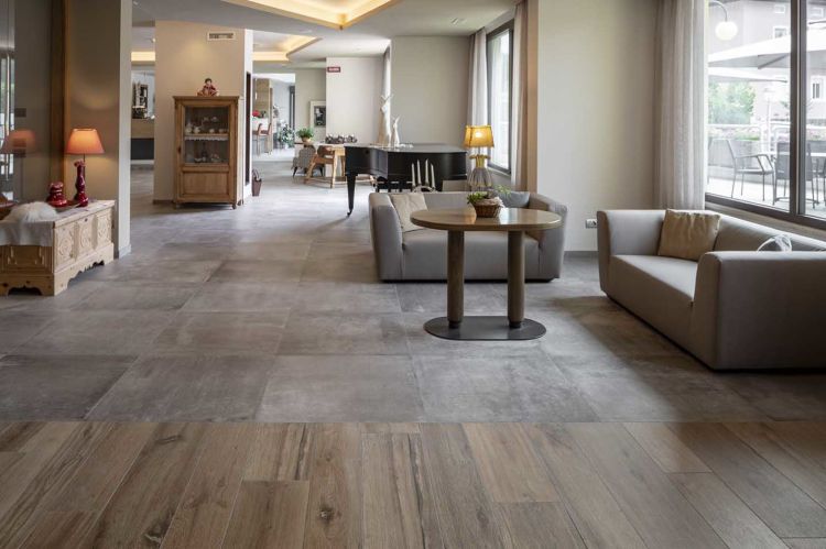 Velice netradiční a zajímavá kombinace dlažby v designu dřeva a betonu ve vstupní hale nově zrekonstruovaného horského hotelu. Konkrétně se jedná o série Matiéres v designu nuage a Planches v designu noisette od italského výrobce REX ze skupiny Florim Group.