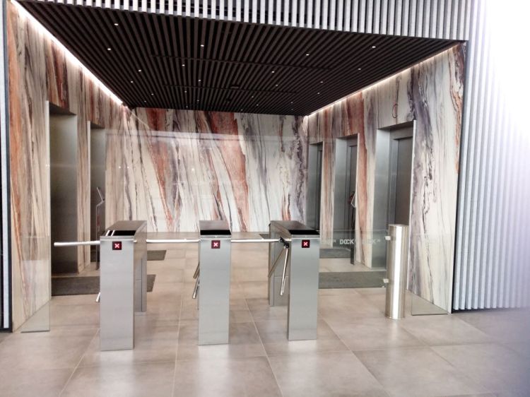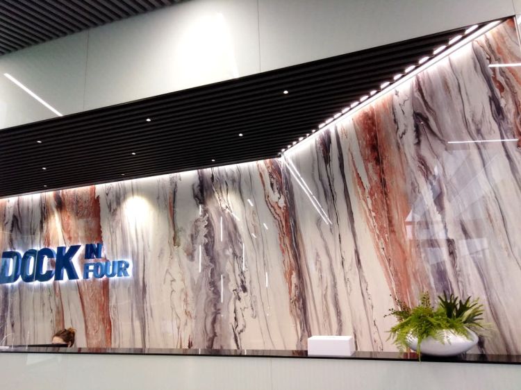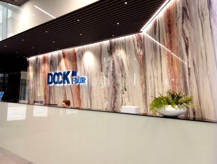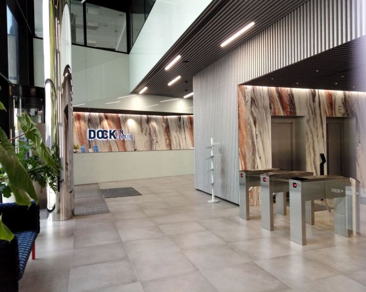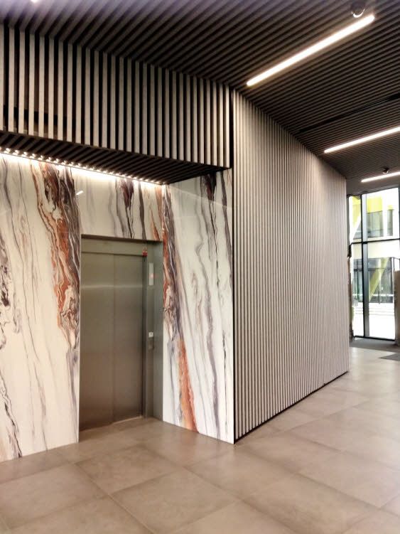 Pro význačného zahraničního investora Crestyl a projekt DOCK IN FOUR dodávala naše firma obložení stěn výtahů. Byl zde použit materiál ze série Liquid Cosmo od italského výrobce Iris Ceramica, v barvě Liquid Purple.