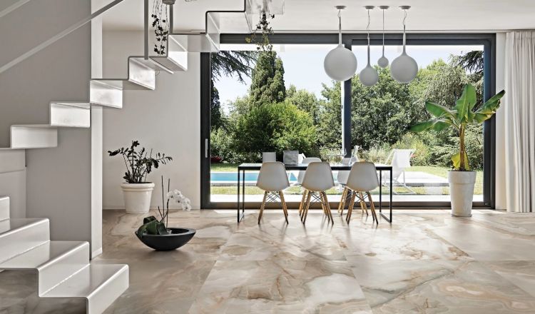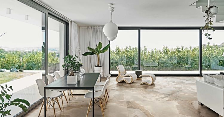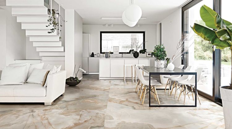 Luxusní obývací pokoj spojený s kuchyní, kde byla použita dlažba série Rêves od italského výrobce Rex v barvě Noisette.