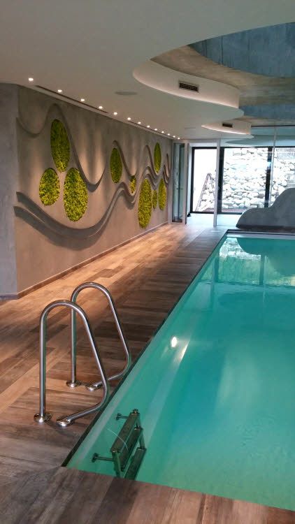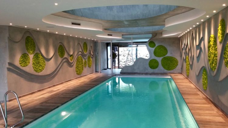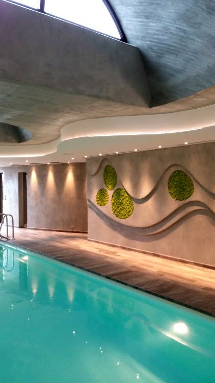 V okolí bazénu se slanou vodou, která bývá velmi agresivní, jsme použili keramické dlaždice s designem dřeva od výrobce Rex. Hrany bazénu byly řešeny tvarovkou, vyráběnou ze základního materiálu v našem výrobním závodě TechnoArt.