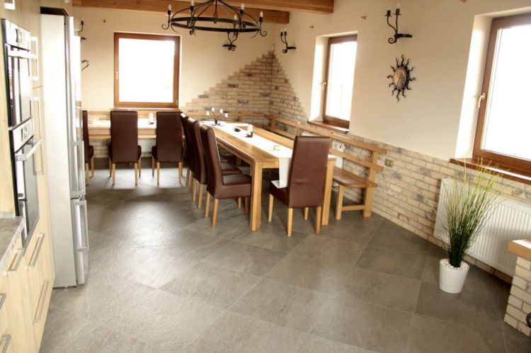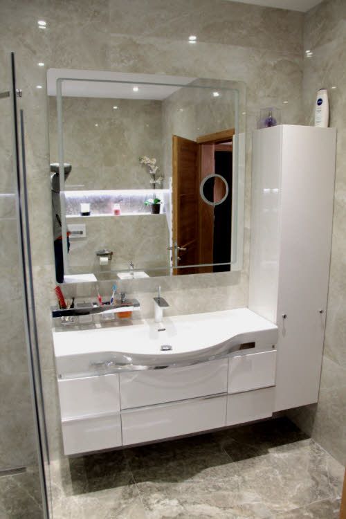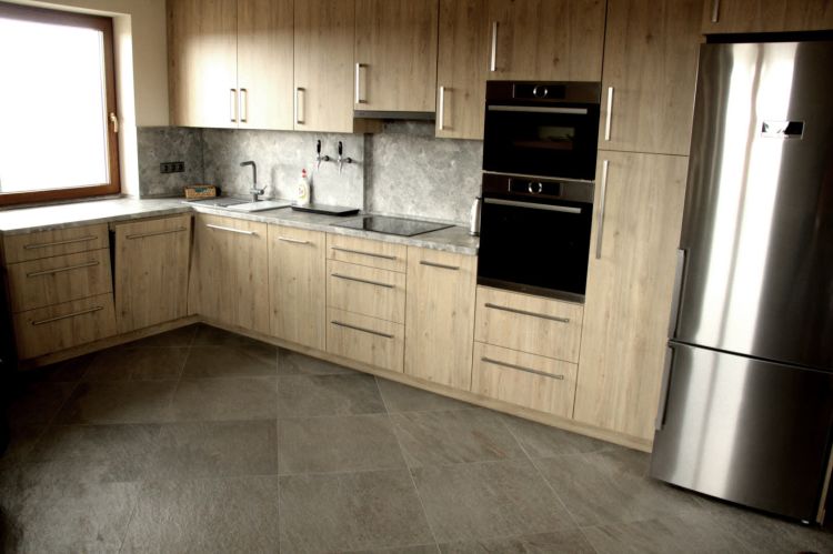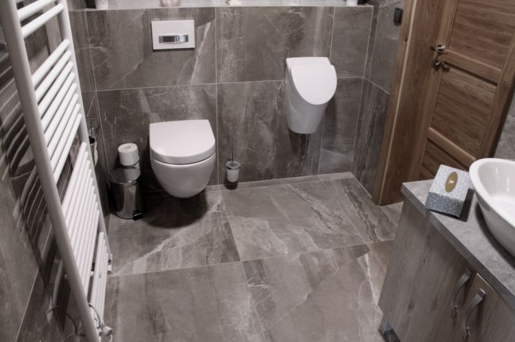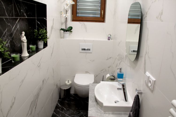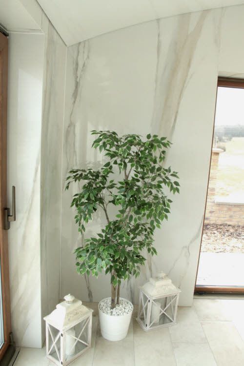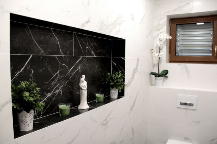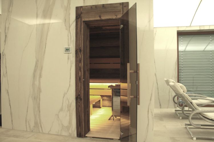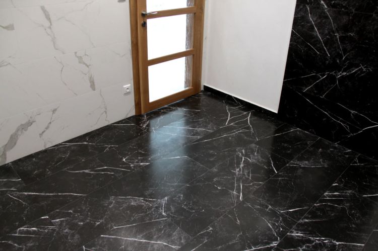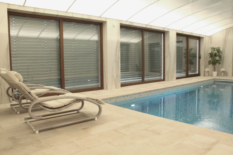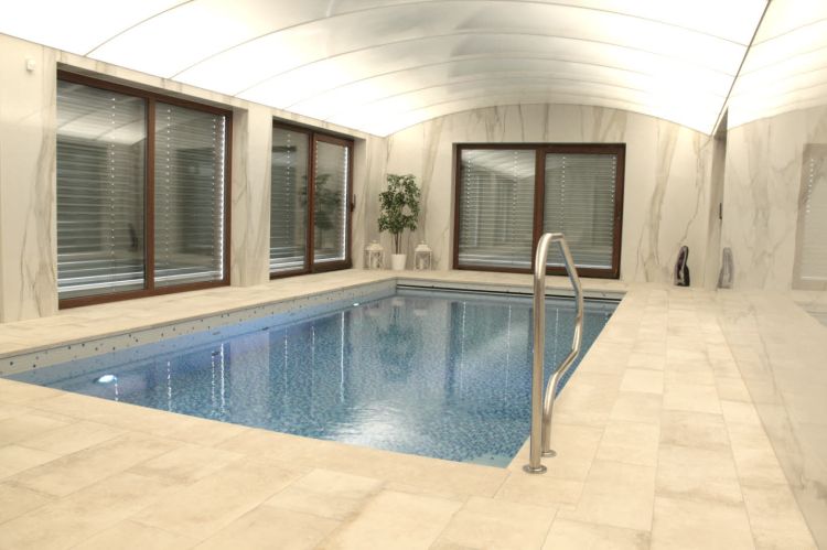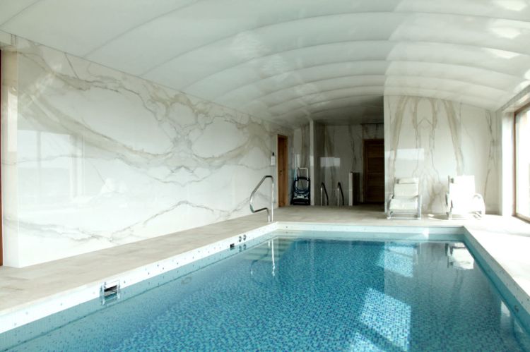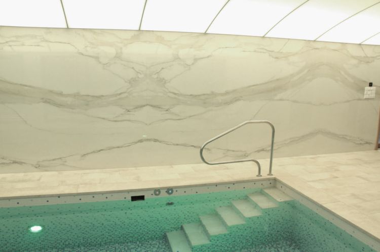 Do pražské vily v Podolí jsme dodávali velkoformátové dlaždice do prostoru bazénu a wellness. Prostory byly obloženy dlaždicemi série I Classici Calacatta Gold od italského výrobce Rex, ve formátu 120x240x0,6 cm a 160x320x0,6 cm, a to i s použitím kompletní skladby, která se skládá celkem ze šesti dlaždic s překrásným průběžným vzorem mramoru. Náš výrobní závod TechnoArt vyráběl elegantní lem bazénu s hranou K2 a také formátoval některé složitější výřezy velkoformátových dlažeb.