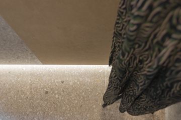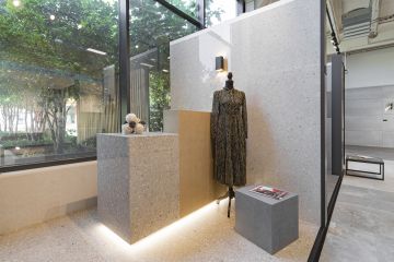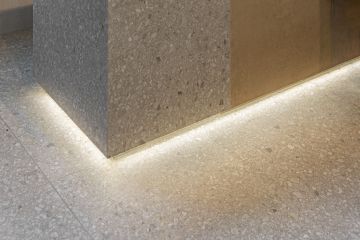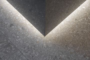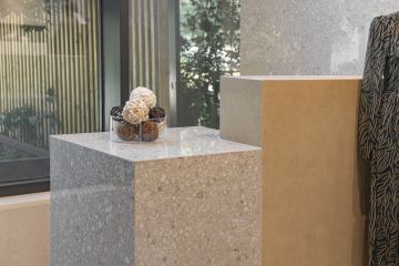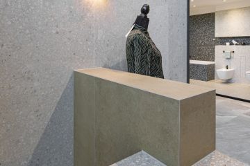 Jedná se o prostor, ve kterém jsme se rozhodli vyvzorovat velmi atraktivní sérii obkladů a dlažeb ze série Match Up od výrobce Cerim ze skupiny Florim. I když prostor prezentační kóje není tak velkorysý jako prostory reálného butiku, i na malé ploše se nám podařilo dosáhnout našeho záměru. V ní naleznete malý prodejní pult, který se skládá ze dvou hlavních prvků – samotného pultu a níže položené, hrubší, manipulační části. Ze spodní strany je celá hmota podsvícena LED pásem, což jí dodává na atraktivitě a zvýrazňuje celý prvek v prostoru. Pult je tvořen odstíny Cinnamon a Cookie mix. Pro odlišení jsme zvolili také dvě vzájemně kontrastní povrchové úpravy – matnou Comfort a lesklou Glossy.