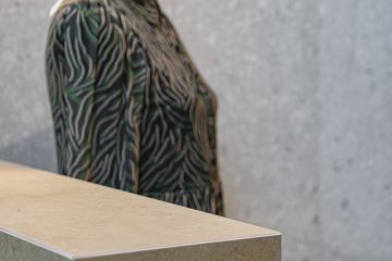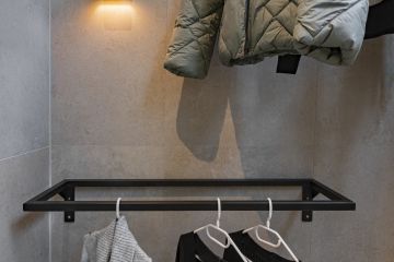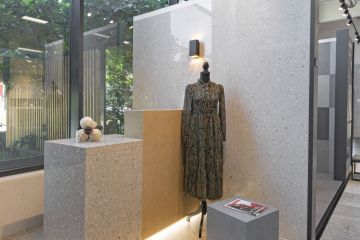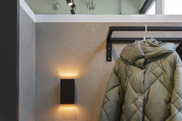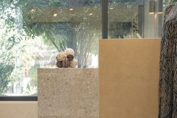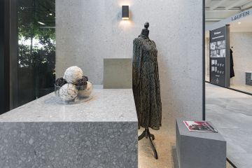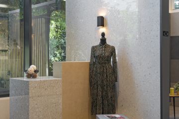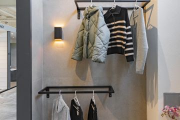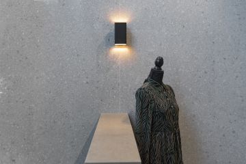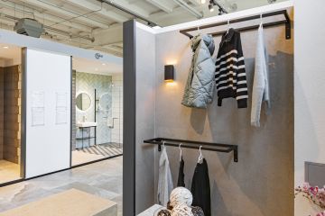 Na stěnách a dlažbě jsou použity odstíny Sugar, Cookie a Blueberry ve formátech 60 × 120 cm. Výjimkou je odstín Sugar Mix ve formátu 120 × 240 cm, který jsme použili na obložení jedné ze stěn. Součástí prezentační kóje jsou také designové věšáky, které jsme vyrobili ve spolupráci s našimi partnery Staupra. Svítidla v této kóji jsou od společnosti London Light.