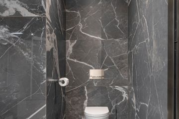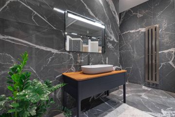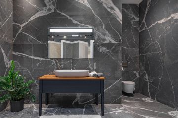 Série Stones & More 2.0 v designu Calacatta Black nabízí krásný a elegantní materiál od italského výrobce Florim. Na přiložených fotografiích si můžete prohlédnout naší prezentační kóji, která je tímto tmavým designem obložená a díky kterému vyniknou i další prvky - nábytek, sanita a doplňky.