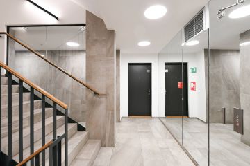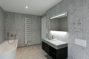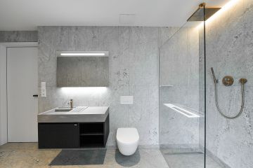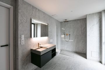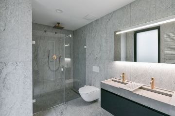 Ve spolupráci se společností Daramis, zejména s architekty Galem Karagula a Danielem Lipskij, jsme zvolili unikátní dlažbu Plimatech italského výrobce Florim. Je zde myšleno na takové detaily jako kombinace multiformátu (vyrobeno v TechnoArtu) se soklem, díky kterému vzniká ucelená stěna. V jednoduchosti je krása a to vytvořená zařizovacími předměty v bílé matné barvě. Kvalitní sprchové kouty dodávala německá společnost Hüppe a krásnou samostatně stojící vanu do rohu a toaletu firma Villeroy&Boch. Středem pozornosti jsou vodovodní baterie v kartáčovaném bronzu ze série Tecturis od dodavatele Hansgrohe. Tyto baterie zdobí krásné umyvadlo z corianu se skříňkou a osvětleným zrcadlem od společnosti LeBon.