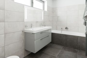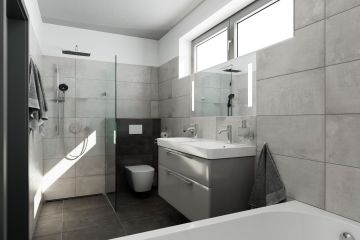 Spolupracovali jsme na projektu Za Panským rybníkem, který nabízí moderní rodinné domy o dispozici 5+kk v Drahelčicích. V přízemí každého domu je obytný prostor s kuchyňským koutem a samostatné WC s prostorem pro vybudování druhé koupelny. V patře jsou k dispozici dva dětské pokoje, ložnice a koupelna s vanou a sprchovým koutem. Klient si mohl zvolit obklady a dlažby v teplé i studené variantě. Tuto možnost nabízí série Florencie od výrobce La Futura. Koupelna je vybavena toaletou, umyvadlem od značky TMS, vanou RIHO a sprchovým koutem.
