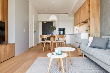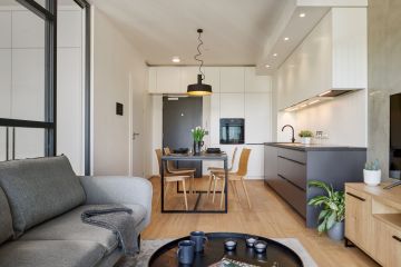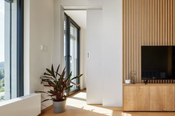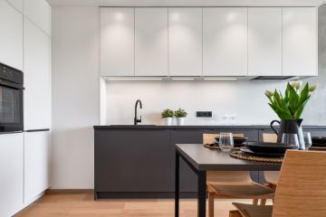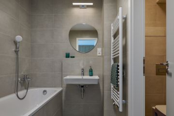 Jeden z bytů nese prvky bílého provedení s rustikálním dubem, ve druhém je naopak sázeno na dramatičtější kombinaci, a to titanové provedení s bílým lakem a kovové prvky. Oba byty jsou skvělou ukázkou toho, jak lze místnosti designově a prakticky propojit a vytvořit tak příjemný prostor pro bydlení a každodenní činnosti. My jsme v rámci této realizace dodali obklady a dlažby od výrobce RAKO a potřebnou sanitární techniku.