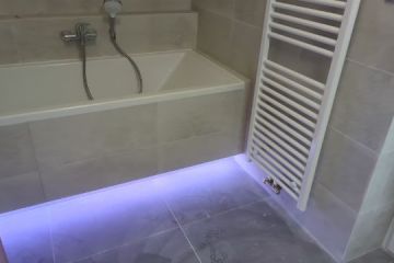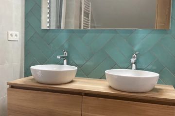 - obklady a dlažby značky Italgraniti v sériích Icone Bleu, Silver Grain (ve formátech 30x60 cm a 60x60 cm), Rock Salt v barvě Smoke a ve formátu 60x60 cm, Pamesa v sérii Kashmir Taupe ve formátu 60x60 cm, Florim v sérii Builtech 2.0 v odstínu White a ve formátech 60x120 cm a 120x120 cm,