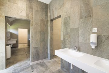 Na přiložených fotografiích je vidět kombinace dvou sérií - Walks/1.0 od výrobce Floorgres ze skupiny Florim a Ermes Alp Stone. Kolekce Walks/1.0 byla použitá v designu grey a v rozměrech 30x60 cm soft, 60x60 cm nat a 60x60x2 cm R11 v kombinaci se sérií Alp Stone v odstínu almond a rozměru 30x60 cm nat.