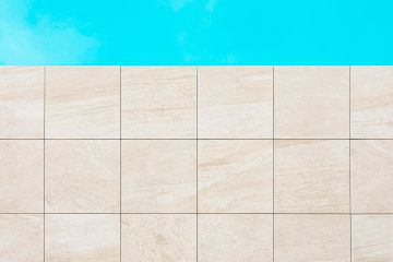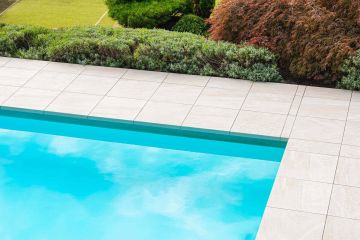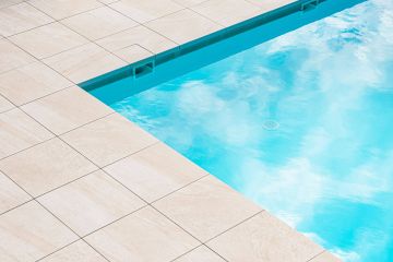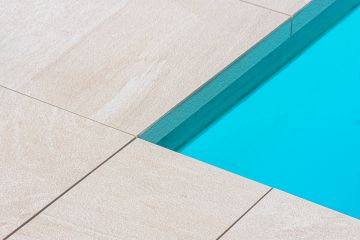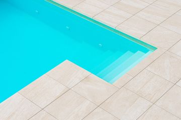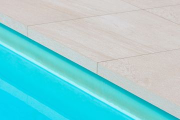 Jako materiál se zvolila dvoucentimetrová keramická dlažba od italského výrobce Italgraniti ze série Mineral D, která svou kresbou a barevností koreluje s architektonickým řešením rodinného domu. Formát dlažby je 60x60 cm. O na míru vyrobené bazénové tvarovky a hrany typu K2 se postaral TechnoArt.