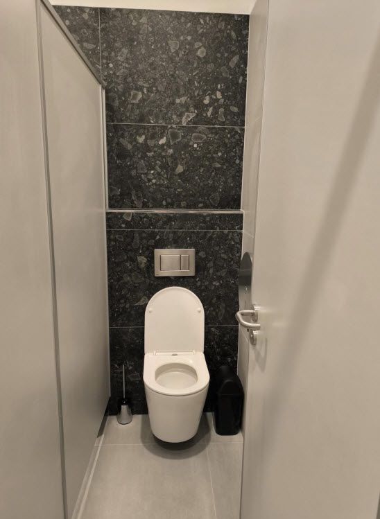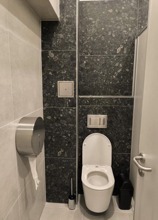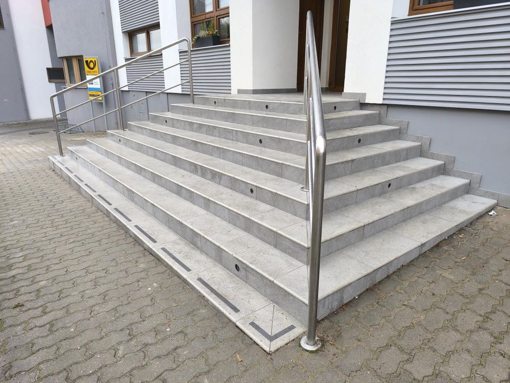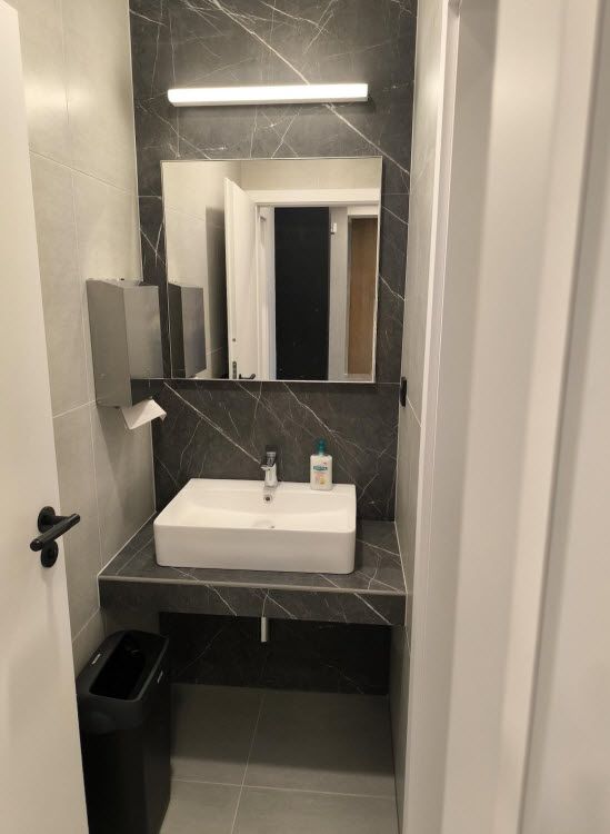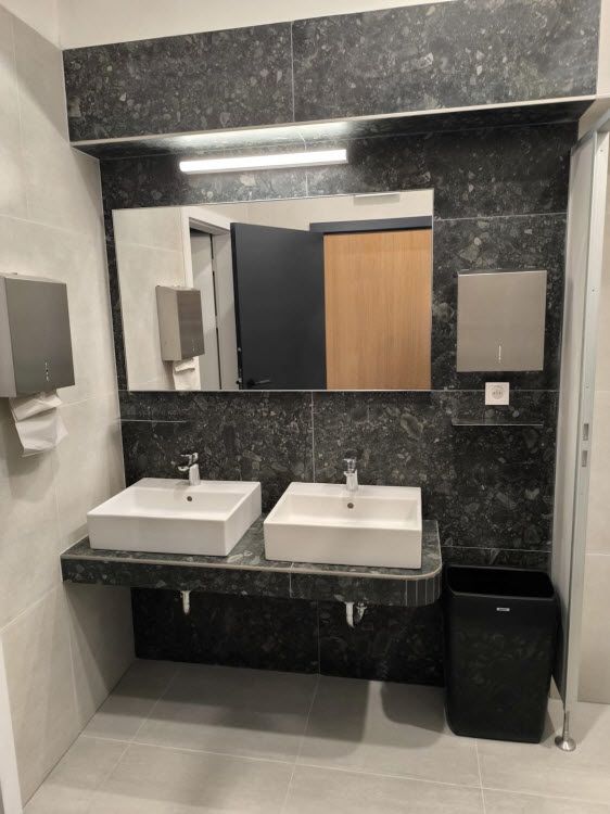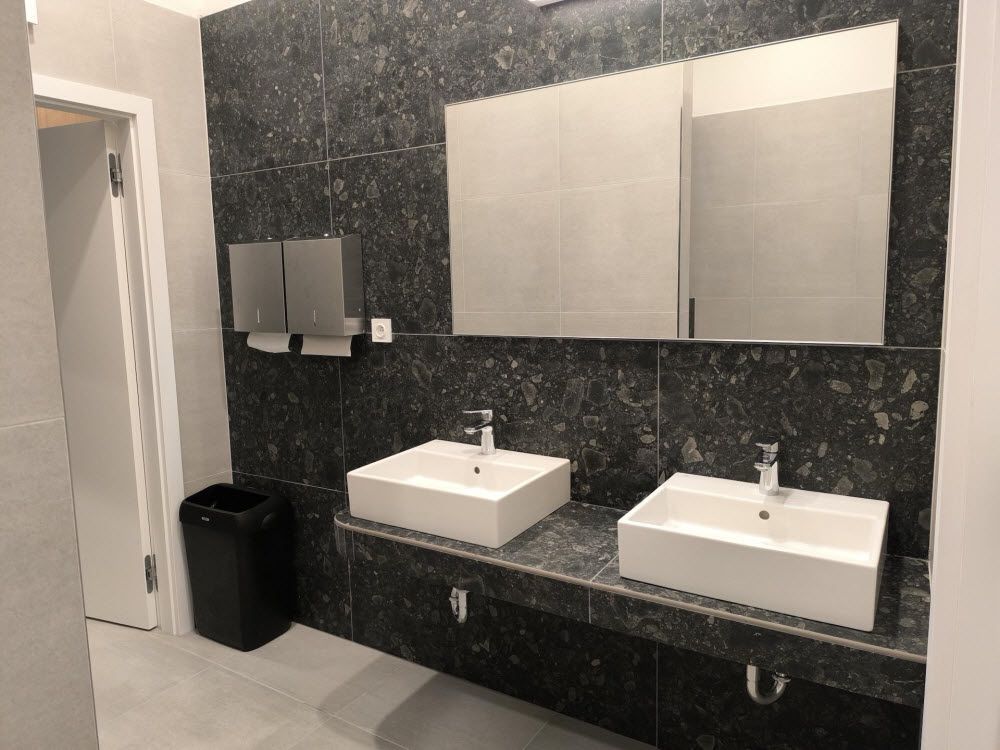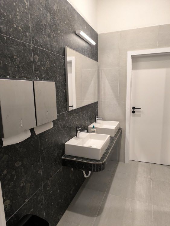 Umyvadlové desky a schodové stupně se zaleštěnou hranou a vloženými kontrastními prvky na vnitřním i venkovním schodišti vyrobili na zakázku kolegové v našem výrobním závodě TechnoArt ve Všerubech. Venkovní schodiště je z dlažby RAKO, série Kaamos Outdoor 60x60x2. Sanita, konkrétně umyvadla a závěsná WC, jsou od výrobce La Futura, série Joy 2.0. Umyvadla vhodně doplňují baterie německého výrobce Hansgrohe, konkrétně série Vernis a nezbytné koupelnové doplňky českého výrobce Bemeta jsou rovněž nedílnou součástí nových sociálních zařízení.