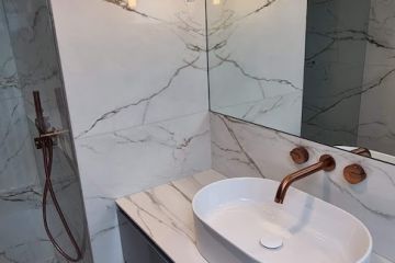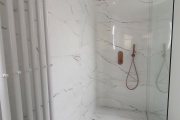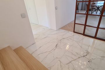 Prohlédněte si realizaci dvou koupelen, toalety a kuchyňského ostrůvku pro náročného zahraničního klienta. Na projektu jsme spolupracovali se známým interiérovým designérem Ivo Prokelem. Dodávali jsme obklady ze série Torano Dorano od španělského výrobce Pamesa. Na podlahy byly zvoleny dlaždice ze stejné série, jen v jiném rozměru 120x120 cm a v matném provedení. Do sprchového koutu jsme zajistili výrobu speciální mozaiky ve tvaru diamantu v naší výrobě TechnoArt. Mozaika byla vyrobená ze stejné dlaždice jako dlažba, aby se tím zachoval čistý design prostoru a zároveň funkčnost protiskluzu při sprchování.