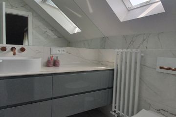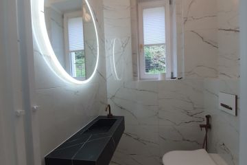 Kompletní sanitární keramika byla dodána od výrobce Villeroy&Boch. Ta vzhledem své letité historii nám výborně sedla do celého konceptu historické vily. Pouze vana byla vybrána od Kaldewei Meisterstück.