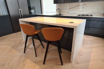 Na kuchyňskou linku a ostrůvek se dodávala keramická dlažba Calacatta Gold od italského výrobce Florim v tloušťce 12 mm a v rozměru 160x320cm. Materiál se na místě upravoval na požadované rozměry.