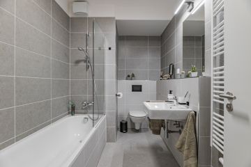 Na tento projekt jsme dodali obklady a dlažby od společnosti RAKO, zejména série Spin a Block. Koupelny jsme vybavili keramikou od prémiového švýcarského výrobce Laufen. Dalšími výrobci, které jsme na tento projekt dodávali, byli Kaldewei, Hüppe, Alca a Grohe. Také jsme dodávali materiál Kamoss od firmy RAKO, který byl určen pro společné prostory. Včetně dlažby jsme dodali i schodnice, o které se postaral TechnoArt.